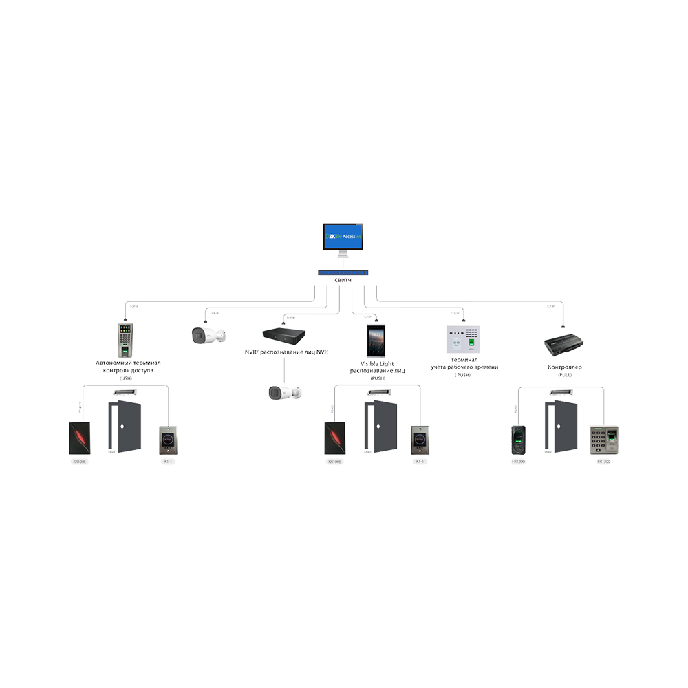 ZKBio Access IVS — веб-платформа предоставляет функциональные возможности, которые отвечают требованиям малых и средних предприятий: управление персоналом, контроль доступа, учет рабочего времени, видеонаблюдение, управление всей системой.